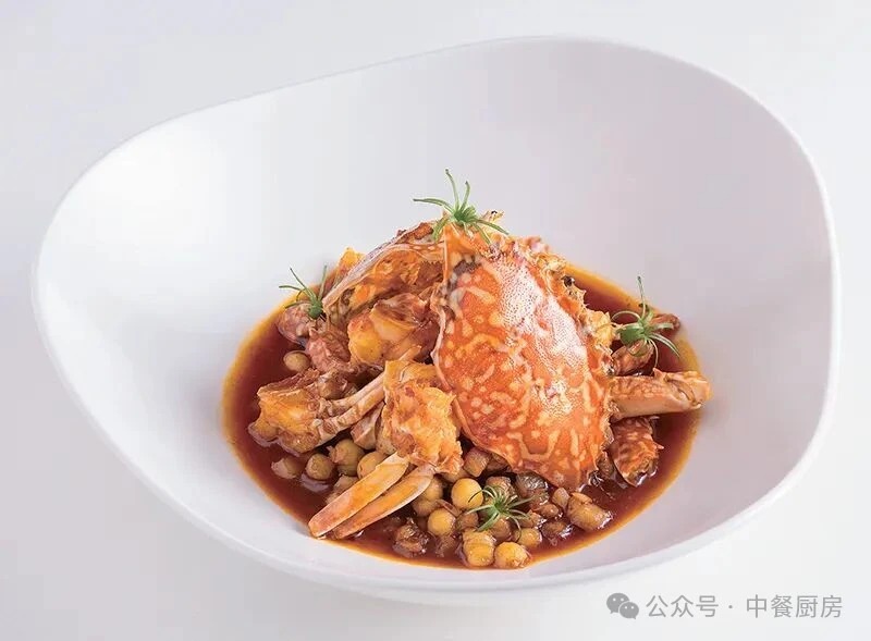 1.将兰花蟹杀好洗净,过油备用。锅中下入阴豆瓣油,将五花肉丁炒至干香,下入蒜、姜、葱头、泡萝卜等炒香后掺入鲜汤,中火烧开,下入兰花蟹和鸡头米,调入味精、白糖,大火收汁。