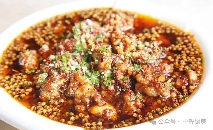 5.净锅放入红油烧热,加鲜花椒、青小米椒圈炝香,起锅淋在盘中激香即成。