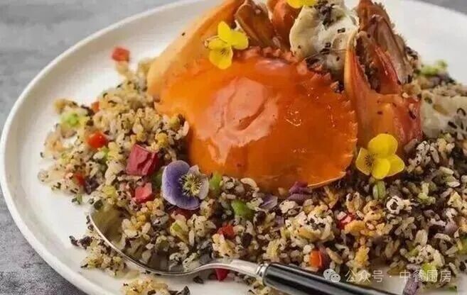 肉蟹1只,黑松露碎30克,姜米10克,香菜粒10克,洋葱粒15克,青椒粒15克,红椒粒15克,米饭230克,炸酥米100。