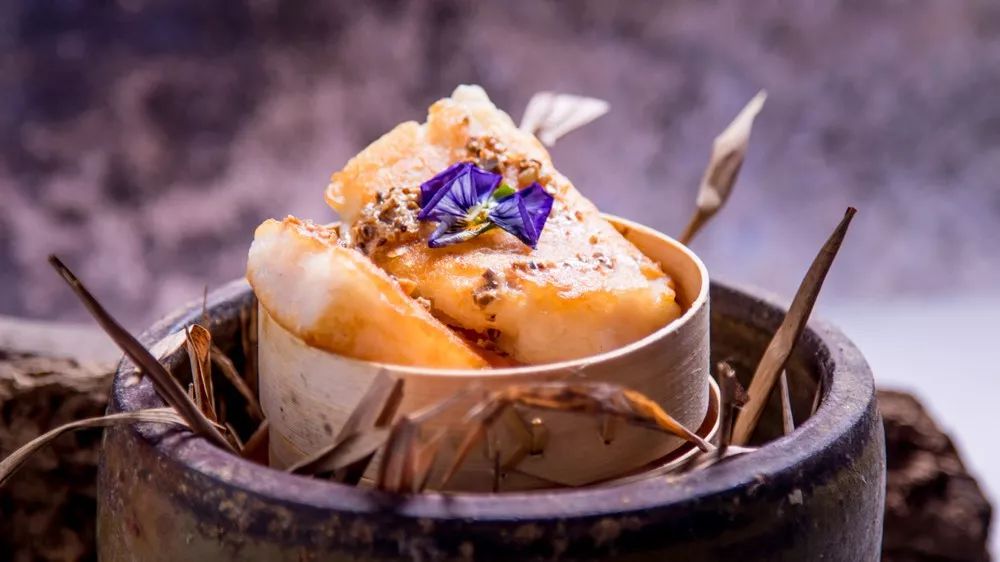 4.用盘子放入小竹笼,摆上煎好的龙趸鱼,淋上制作好的松茸汁,加三色瑾一朵即可