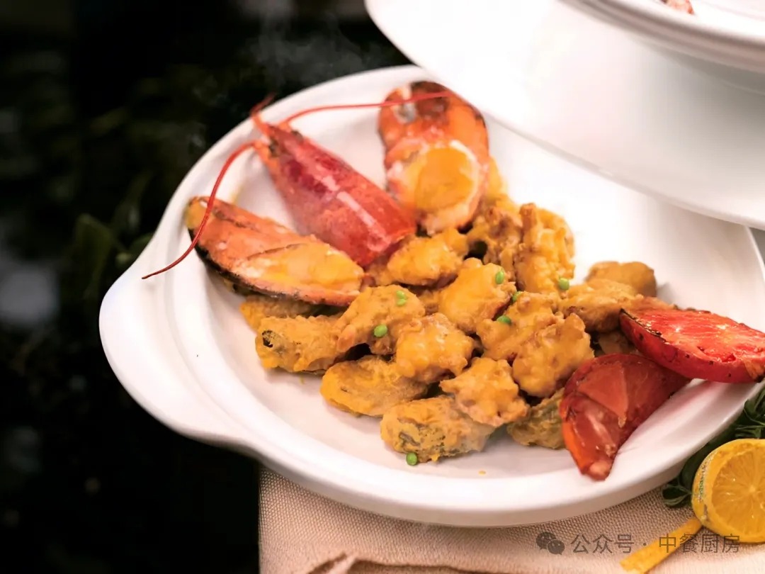 4、将炒好的咸蛋黄倒入炸好的龙虾块和栗栗南瓜块中,翻拌均匀,起锅后,将翻拌好的食材摆在虾头和虾尾中间,稍点缀青豆即可。