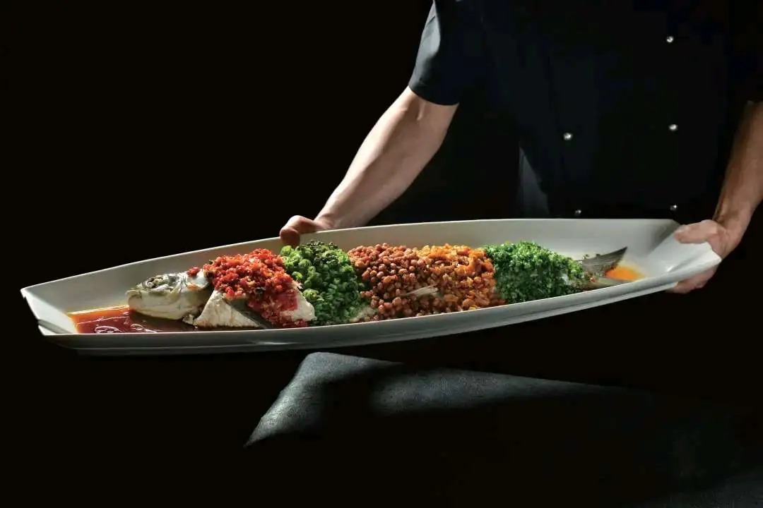 3、将腌制好的鱼装入长盘中,鱼身上均匀间隔地浇上剁椒酱、金椒酱、豆豉酱。注意酱料的分布要均匀,以便蒸制时各种味道能够充分融合。将装有鱼的盘子放入蒸锅中,大火蒸制约12分钟,或至鱼肉完全熟透。具体时间可根据鱼的大小和火力大小适当调整。