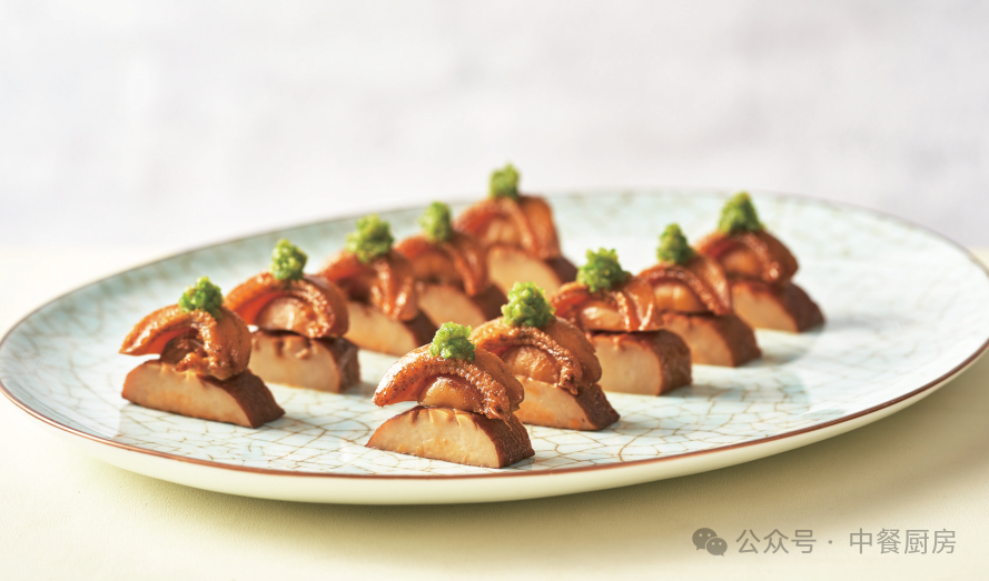 2.杏鲍菇对剖成两半,入热油锅炸至色金黄,然后入辣卤水中卤制30分钟,浸泡30分钟,起锅改刀成大小均匀的块,与鲍鱼一起装盘,稍点缀即成。