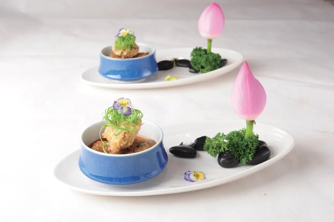 小鲍鱼12只(约1000克) 、子姜100克、小米椒50克、泡辣椒50克、姜片、葱节、葱丝、盐、料酒、味精、鸡精、白糖、干淀粉、自制蜂巢粉、鲜汤、菜油各适量辣卤水1锅荷花若干朵