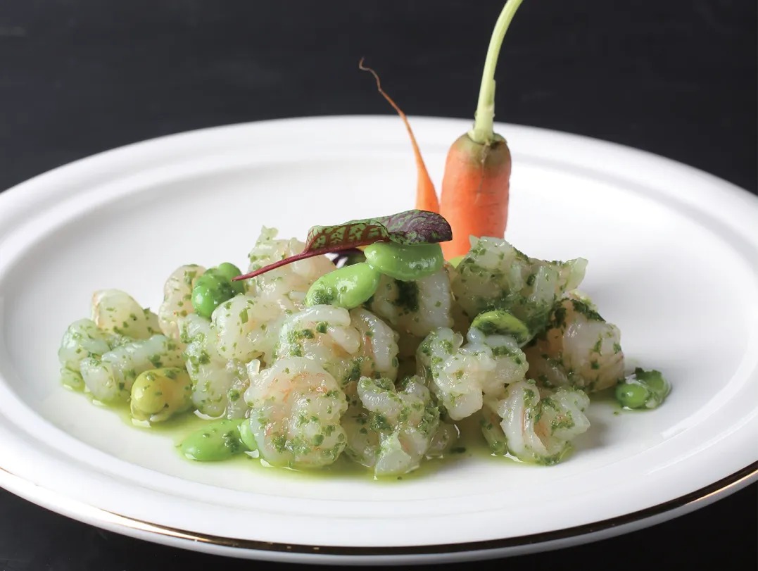 蝴蝶虾仁125克、去皮蚕豆50克、椒麻糊20克、盐1克、味精1克、鸡精1克、鸡汁4克、葱油10毫升