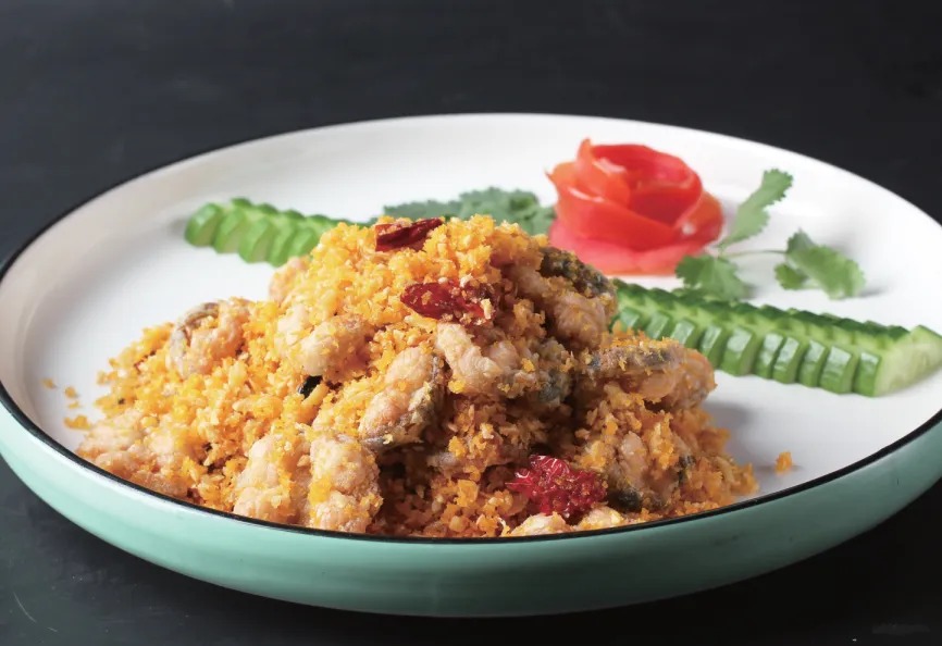 3.锅留底油,依次下入干辣椒节、豆豉和面包糠炒香,放炸蒜粒和炸过的鳗鱼片,调入盐、白糖、味精炒匀入味,出锅装盘即成。