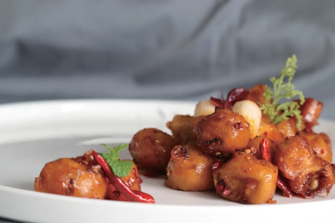 3.净锅放入煳辣油烧热,下入干辣椒、花椒、姜蒜片、大葱节炒香,放入调好的宫保汁,然后加入炸好的鹅肝球,收汁亮油即成。