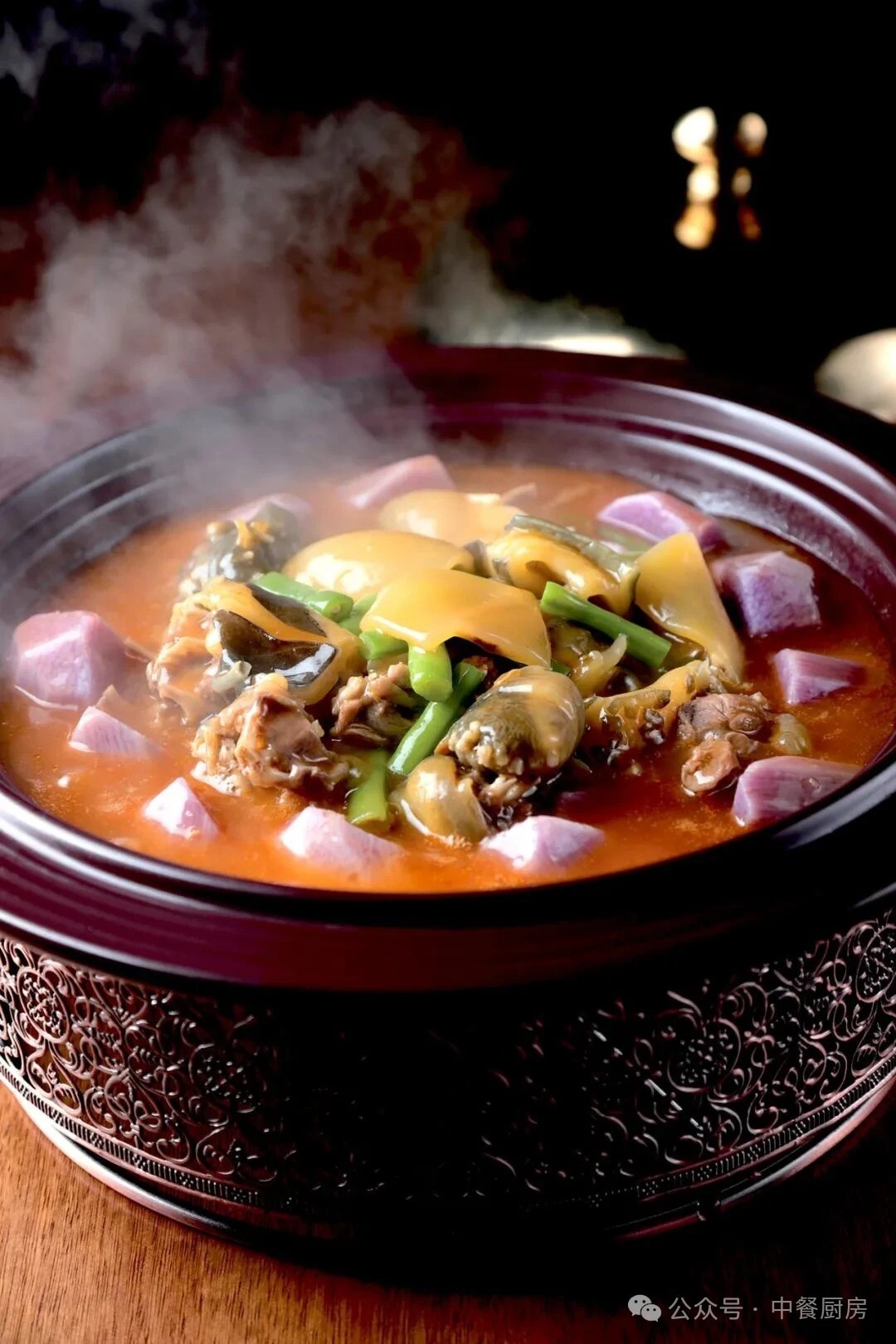 4.另锅将苕皮块也用金汤收至熟且入味,起锅盛入烧烫的砂锅里垫底,再将收好汁的甲鱼块倒在苕皮上。最后将滑过油的青椒节浇在甲鱼上即可。