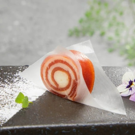 2. 将果丹皮用油纸夹起,擀面杖将其擀薄,涂上山药奶酱抹匀,卷成卷入冷冻定型;