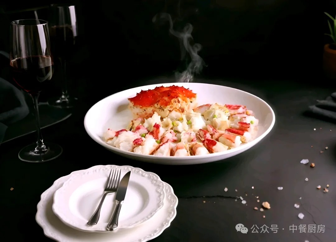 3. 初步蒸制帝王蟹:将处理好的帝王蟹放入蒸盘中,摆好造型。入蒸箱蒸制2分钟左右,取出控水。这一步的目的是为了去除蟹肉中的部分水分和腥味。