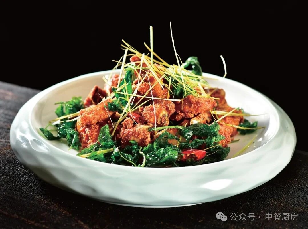 1.把猪排骨洗净,砍成大小拇指的块,冲净血水,控干水分, 纳盆后放入盐、白糖、味精拌匀码入味,再加鸡蛋液、生粉、糟辣子汁水抓拌均匀。另把薄荷、鲜香茅草丝下入热油锅提前炸酥,其中把炸酥的薄荷放盘里垫底。