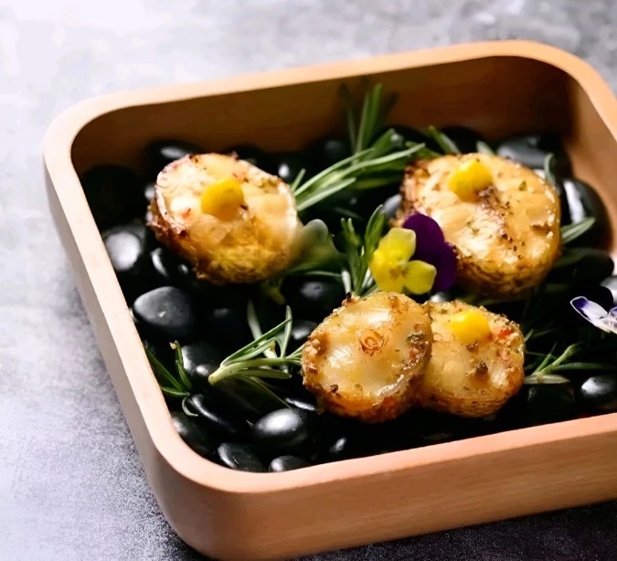 5. 装盘:提前准备预热过的鹅卵石放入木盘,以增加就餐体验。将烤好的银鳕鱼摆放在鹅卵石上,在银鳕鱼上挤上芒果酱汁,并点缀上一些花草,如迷迭香,以增加菜肴的美观性。