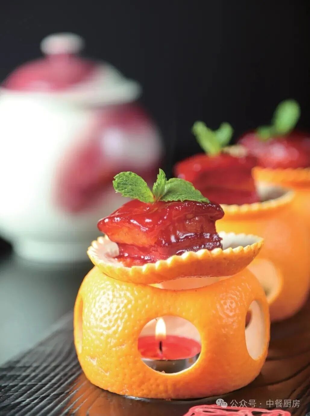 5.下入五花肉块和橙肉,烧沸后转小火烧至软糯入味且汁水自然收浓时,出锅装入橙灯盛器内,稍加点缀即可。