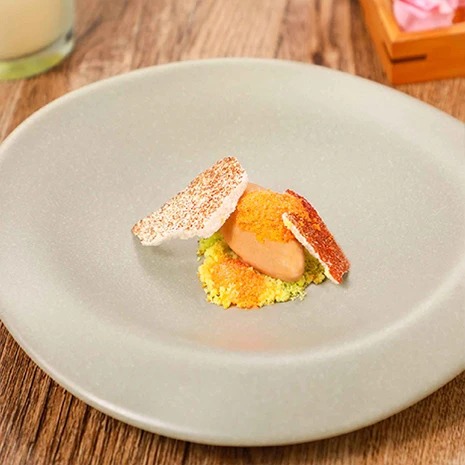 7. 用汤匙装少许葱油粉末在盘中,豆腐冰淇淋挖球装粉末上,撒上红油冰沙,放上蛋白霜即可。