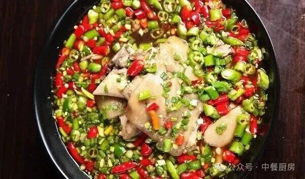 2、金针菇投入沸水锅里汆一水,捞出来放钵里垫底,再放入煨好的肘子。锅里掺适量清水,烧开后放入青椒节和红小米椒节、蒸鱼豉油、辣鲜露、保宁醋,出锅舀在钵里肘子上,最后撒上葱花便好。