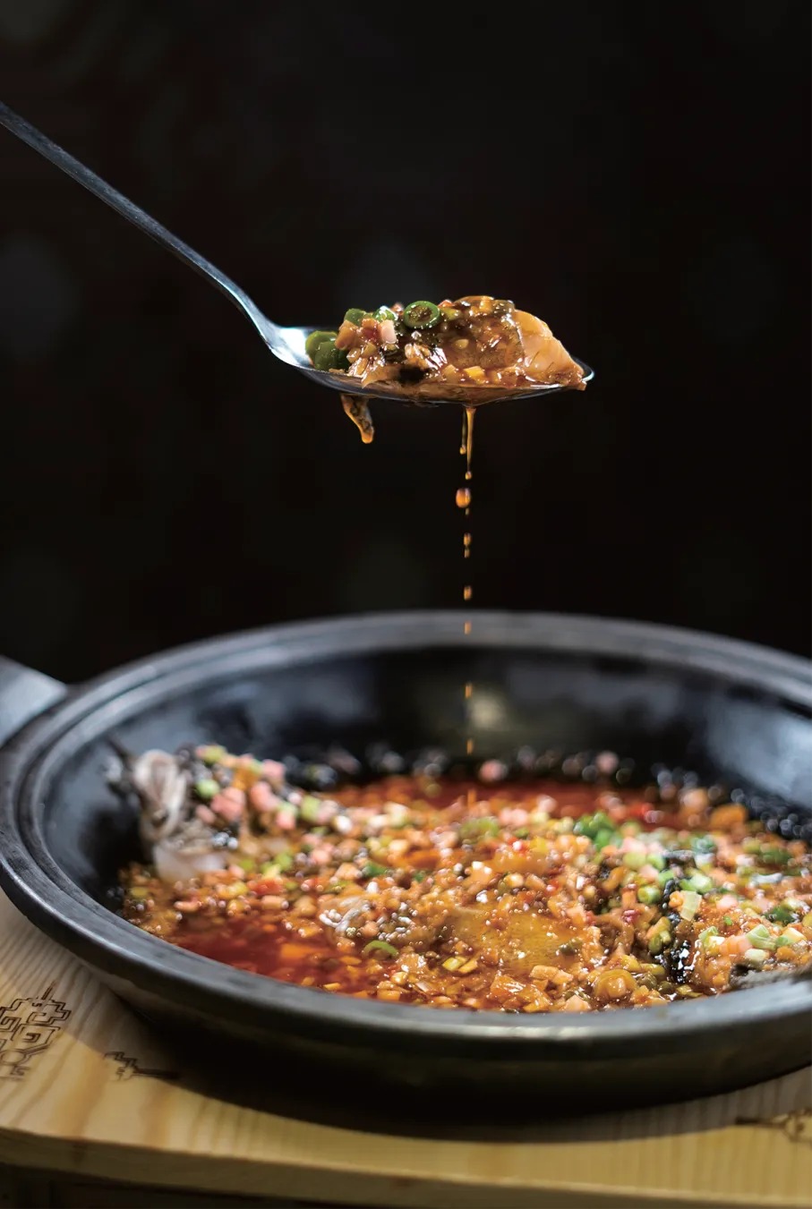 2.净锅放油烧熟,下泡椒末、青红椒圈、蒜米和小葱节先炒香,掺入适量鲜汤烧开后,放入美蛙块、芋儿并下盐、味精和辣鲜露。待小火烧至入味时,用湿生粉收汁并淋少许的香油,起锅装盘便上桌。