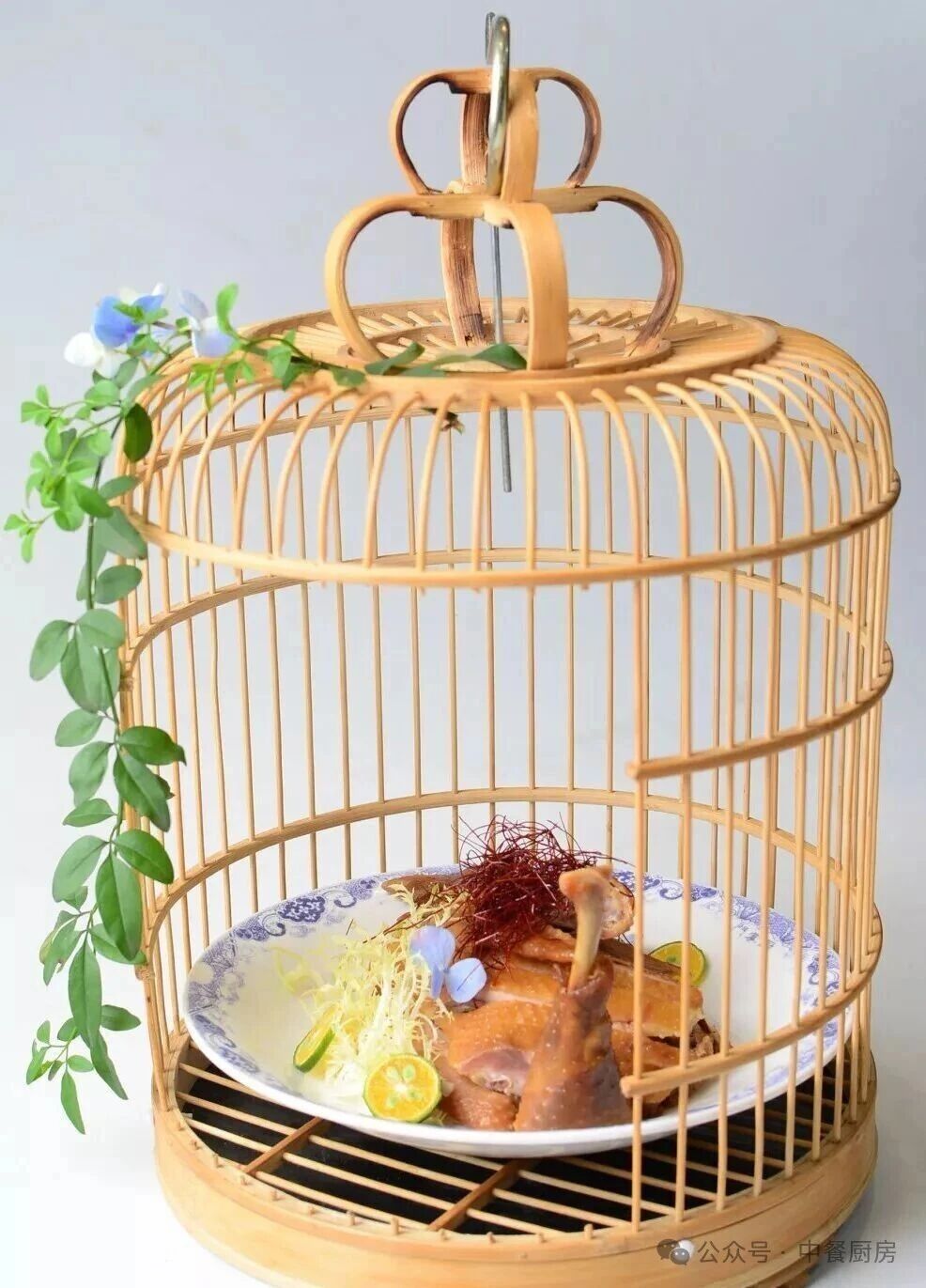 3.临走菜时,把卤好的整鸡改刀装盘,撒上事先炸好的姜茸丝,用柠檬片等点缀,把盘子摆入鸟笼形盛器内,即成。