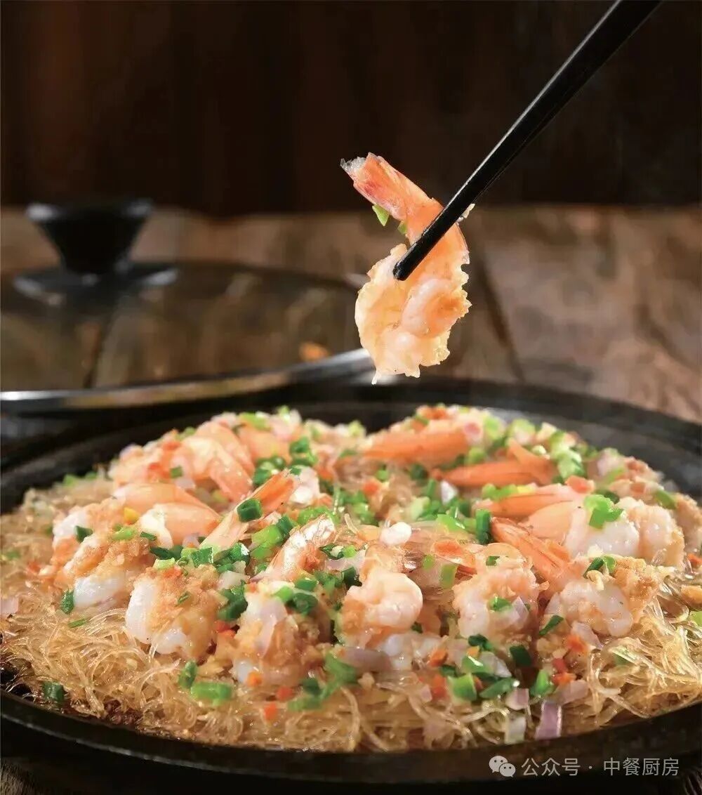 3. 将洋葱丝、金针菇垫于煲仔盘底,铺上拌好蒜蓉酱的粉丝,撒入韭菜节,再把码味后的虾仁均匀地摆入盘中,淋上剩余的蒜蓉酱。然后沿周围倒入清水50 毫升和豉油汁,置煲仔内加盖大火上汽,转小火焖约7分钟,至虾仁变色熟透、水分收干时,关火撒入葱花和甜椒粒即成。