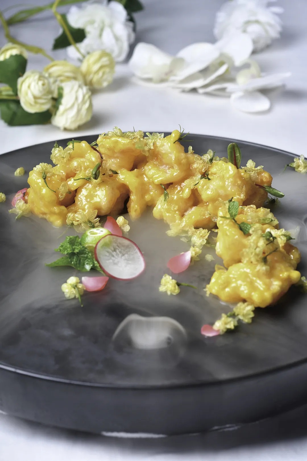 4.将炸好的虾球和茉莉花裹匀酱汁,摆入盘中稍加装饰即成。