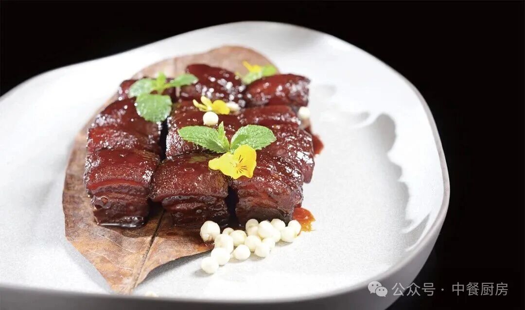4.锅里放油,加冰糖炒至枣红色时,放入浸泡好的五花肉块炒香,再加姜片、葱节炒香,然后加红酒和水烧开,放入八角、香叶、桂皮、小茴香,改小火慢煨至入味,其间调入盐、味精、鸡精,最后大火收汁,按一盘菜的量分别装盘,稍加装饰,即可。