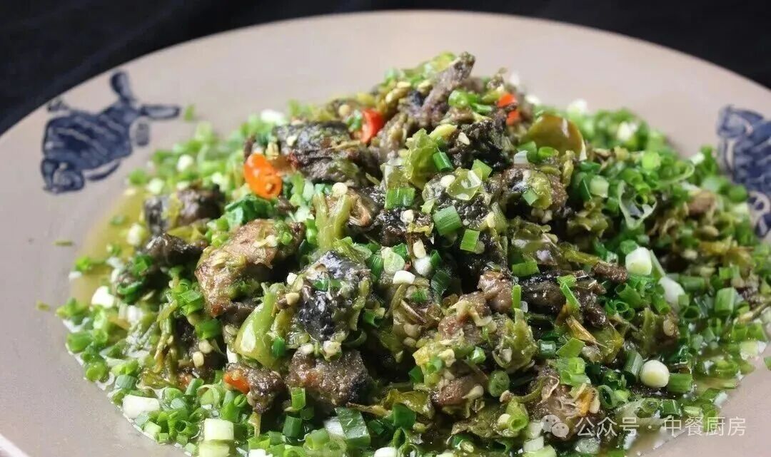 3.净锅放油烧热,下入乌鸡丁过油后倒出沥油。锅留底油,下烧椒炒香后加放乌鸡丁一起炒匀,然后加盐、味精调味,炒至略带干香起锅装盘,最后撒上葱花和少许小米椒节,用热油激香成菜。