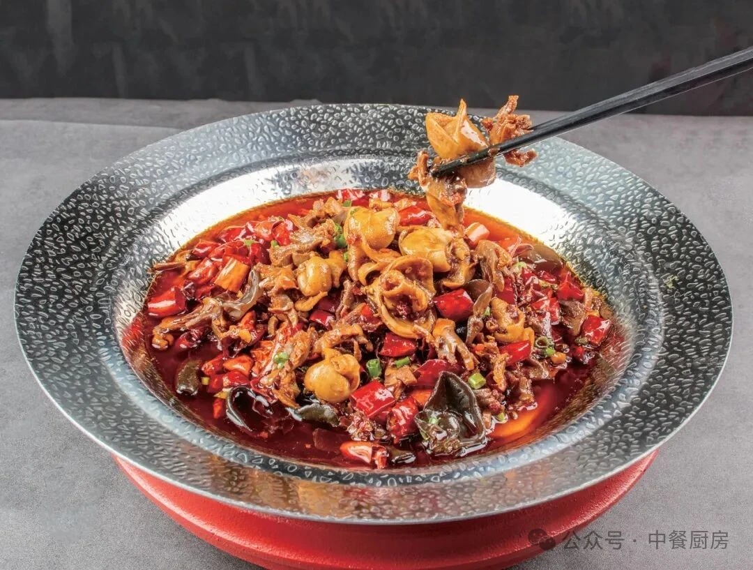 2.净锅入煳辣油和化猪油烧至五成热,下入干青花椒、干辣椒节炝香,放入码好味的鲑鱼肚和鸭胗花爆炒至熟,调入盐、味精、鸡精、白糖炒入味, 出锅装盘, 撒些葱花,即成