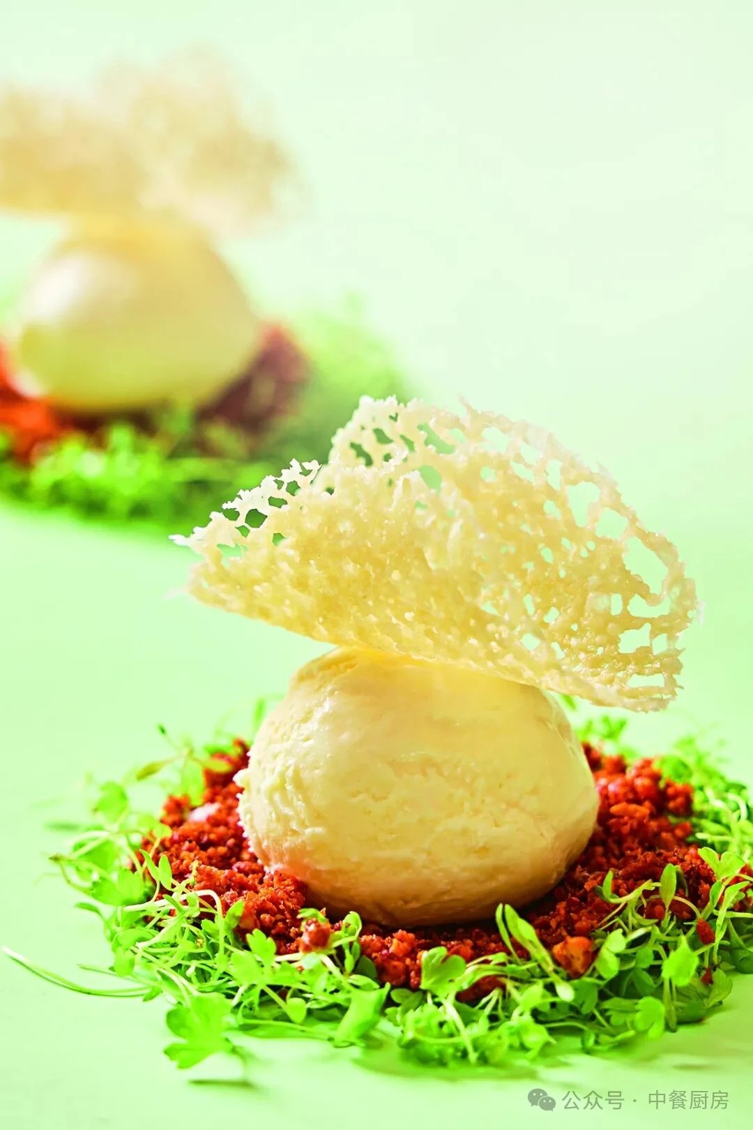 3.将辣椒粉与花生碎、腰果碎混合均匀,舀在盘中垫底,将冷冻好的冰淇淋挖成球,放在辣椒粉上,放上塑好形的马苏里拉芝士点缀即成。