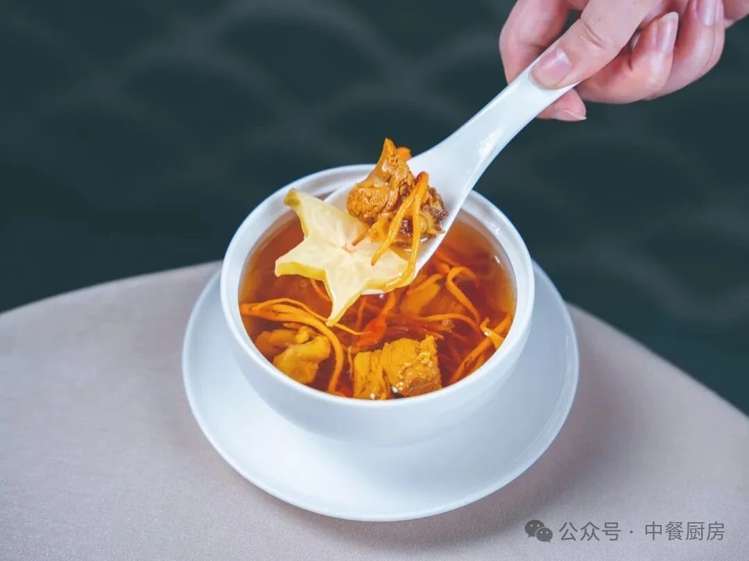2.取炖盅下入姜片,放入凤爪块、猪精肉丁、老鸭条、虫草花和杨桃,调入盐、胡椒粉、鸡精、味精,注入适量的纯净水,加盖入笼蒸约4小时,即成。