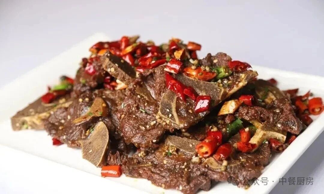 2.锅留底油,投入干辣椒节、干花椒、二荆条辣椒节和红美人椒节爆香,放入炸酥的牛脊骨块,调入鸡精、味精、白糖、美极鲜酱油和红油炒香入味,淋上花椒油和香油,撒孜然粉和白芝麻颠匀,出锅装盆即成。