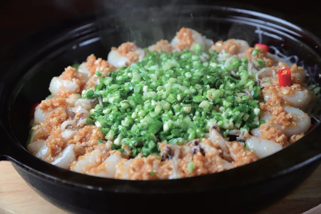 1.把墨鱼仔治净,用姜葱汁、盐、料酒腌入味,整齐摆放在垫有水发粉丝、青瓜条的铁板盛器内,淋少许色拉油,待用。