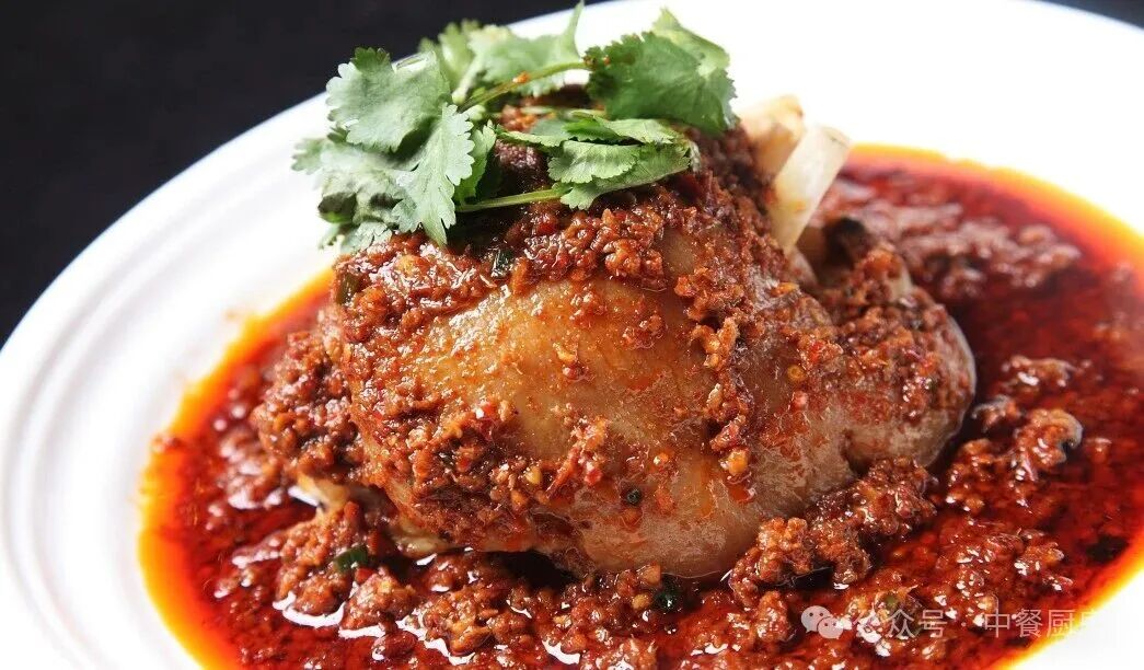 2.锅里放菜油烧热,放入姜米、甜面酱和豆瓣酱先一起炒香,掺适量鲜汤烧开,其间加酱油、味精、鸡粉、白糖和香醋调味。等锅里已收至汁浓时,淋入香油并出锅舀在盘中猪肘上面,最后点缀香菜叶便好。