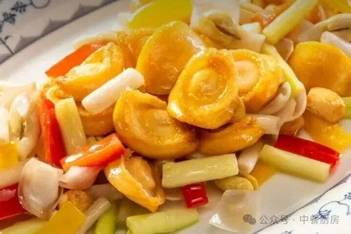 1 、黄金鲍常温解冻去除头部口器,洗净焯水后再过油