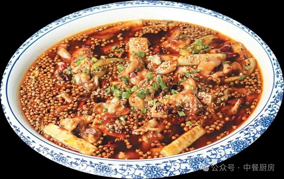 2.净锅入化猪油和菜籽油,下入姜米、蒜米、葱花、湖南泡黄贡椒末炒香出味,掺入鲜汤,用中火熬出味,打去料渣不用,即得酸辣汤汁。然后调入盐、味精、鸡精,下入青笋丝、金针菇煮熟,捞入窝盘里垫底,再放入千层肚煮入味,撒些小米椒粒推匀,起锅装盘即成。