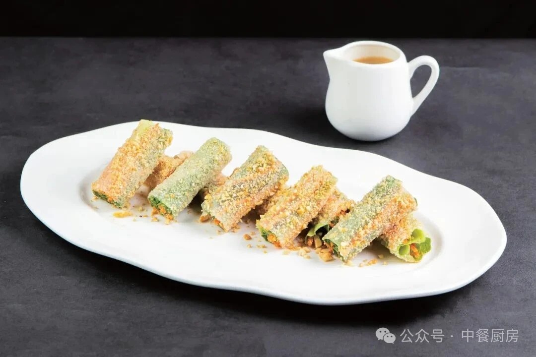 2.取泡好的越南春卷皮分别包上油麦菜叶、青笋丝、胡萝卜丝、苦苣心,卷裹成圆条状,再粘匀熟花生碎、芝麻碎,用刀切成节,装盘造好型,随配调好的麻酱汁上桌,食用时把麻酱汁淋在包有蔬菜的春卷条上,即成。
