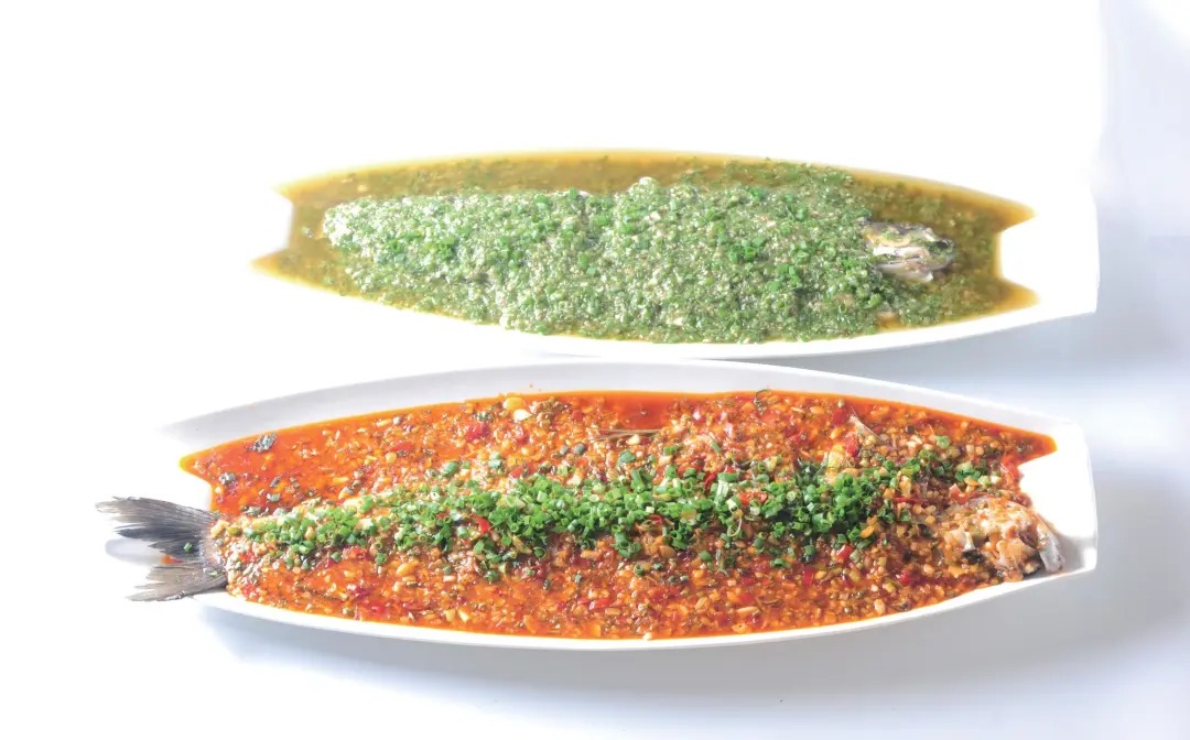 2.炒制泡豇豆味汁:锅中下色拉油200毫升,依次下入泡豇豆末、泡姜末、泡辣椒、豆瓣、姜米100克、蒜米200 克,炒至水汽略干、油脂呈红色时,加水400毫升煮沸,再下入调味料,勾芡起锅,将汁水淋入鱼身,再撒上葱花(或藿香丝) 即可。