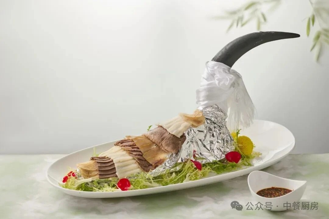 4.将切好的肉片依次整齐铺在牛头骨上造型,牛角处系一根哈达,盘边用苦菊环绕一圈,撒上玫瑰花瓣点缀,搭配酸辣味碟即可上桌。