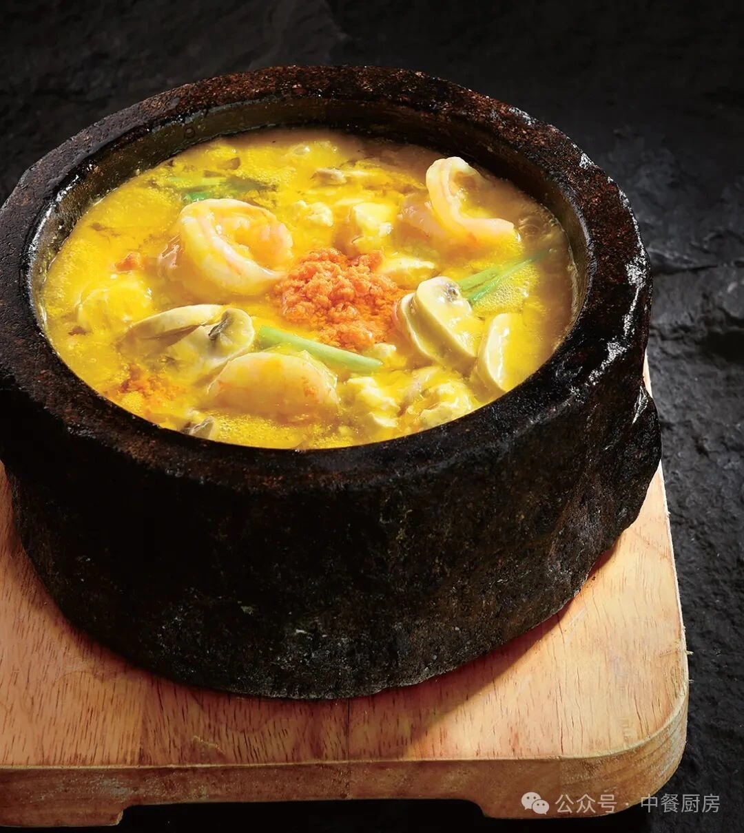 2.锅中加入鸡油烧热,放入姜片、葱段、口蘑片、虾仁、咸蛋黄酱、海胆酱炒香,倒入高汤、豆花块、金瓜蓉烧至浓稠,放盐、味精调好味后起锅,装入提前烤好的石锅内即成。