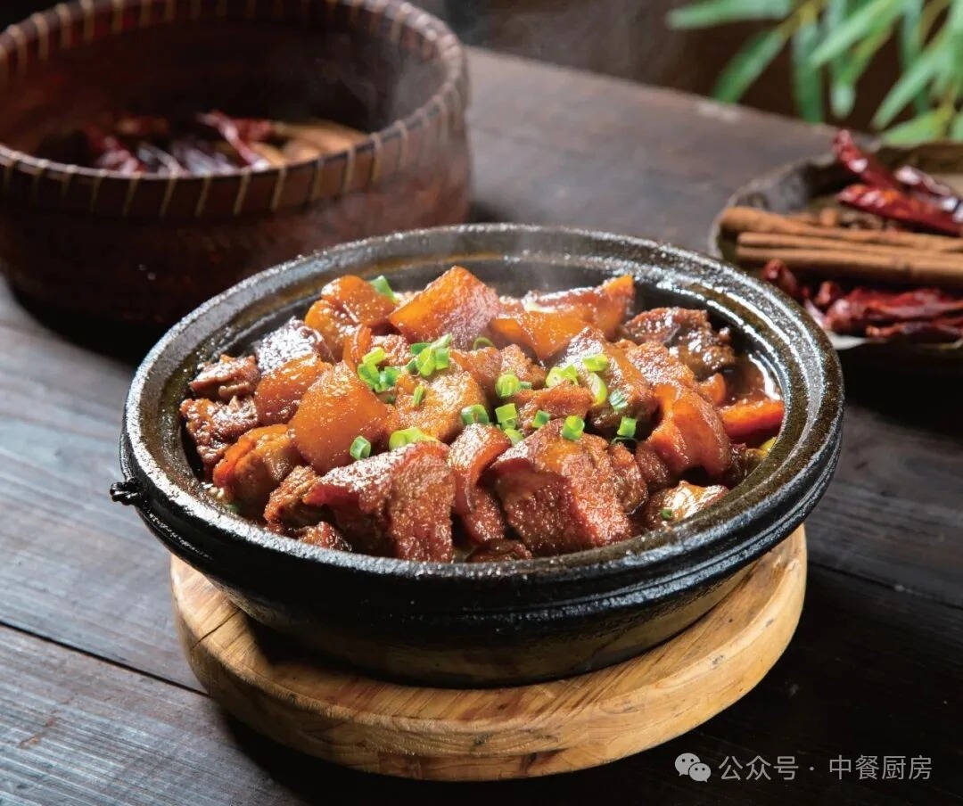2.取干净砂锅,依次放入洋葱、尖椒和炸好的红烧肉,调入自制红烧料烧开,慢煮入味,最后大火收汁亮油,撒上葱花即可。