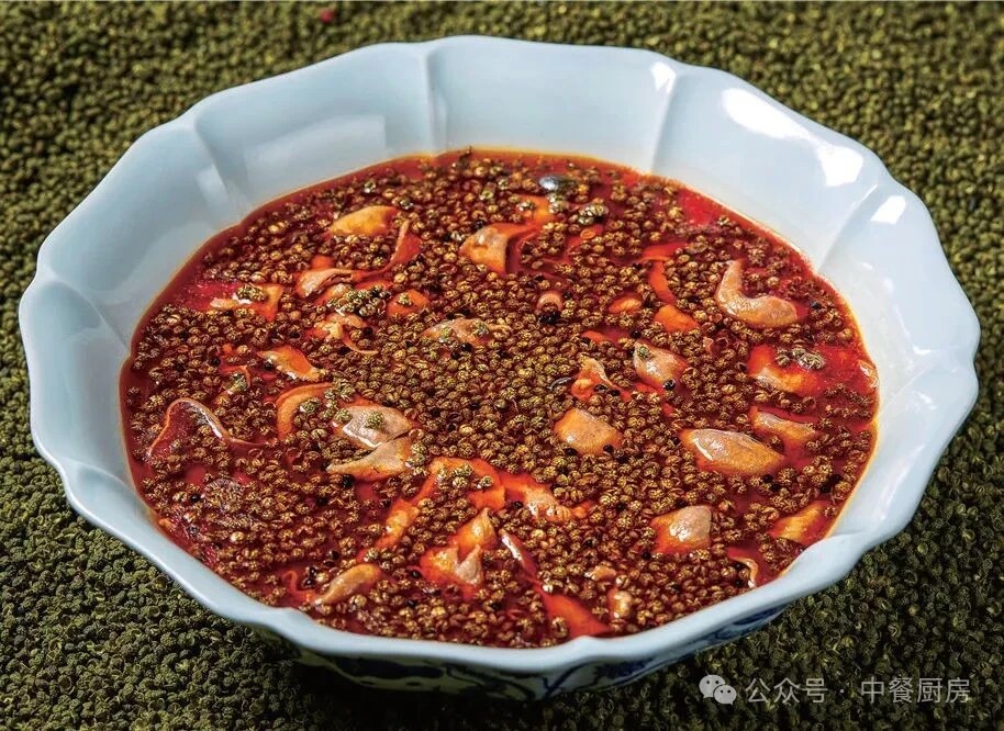 5.干青花椒汆水20秒,捞出来沥水后下入烧至五成热的油锅,炸至开花变色,淋入适量花椒油、藤椒油,泼在舌片上激香即可。