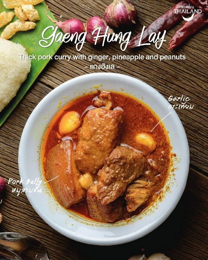 图六:【黄咖喱猪肉Gaeng Hung Lay】黄咖喱猪肉起源缅甸,传到泰北就改良为少油版本,是在清迈和泰国北部府区的常见菜品。黄咖喱、酸角、猪肉、葱和虾酱为主要原料,大蒜,姜黄的混合气息会让你想起印度料理;由于没有加椰奶,咖喱汤虽显清淡,但是同样拥有层次丰富的香味。