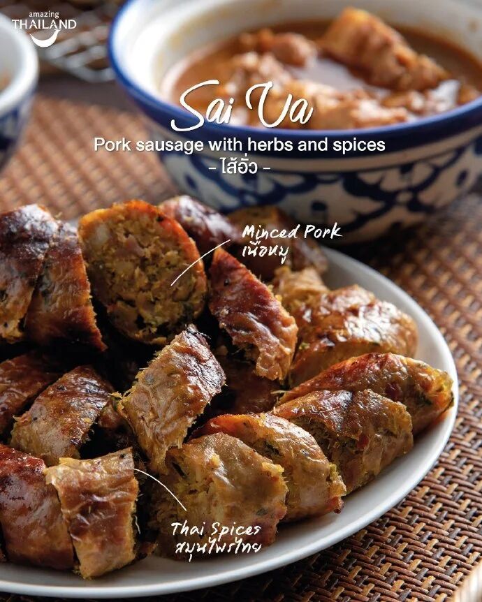 图三:【泰北香茅肠Sai Va】这是一款用香茅草制成的猪肉肠,是泰北著名的街头美食,也是清迈当地的特色小吃,在大街小巷都能找到,价格便宜,香气独特。香肠除了香茅草还加进辣椒、葱等香辛料,煎好切块后一般搭配大蒜、花生、生菜食用。