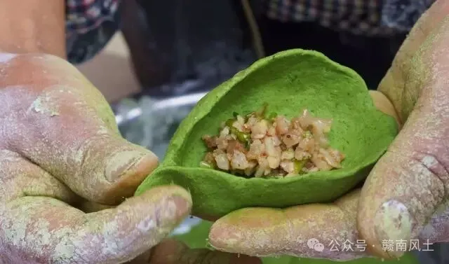 5、像包饺子一样包上事先备好的配料,如腌菜、豆腐干、春笋、腊肉等。