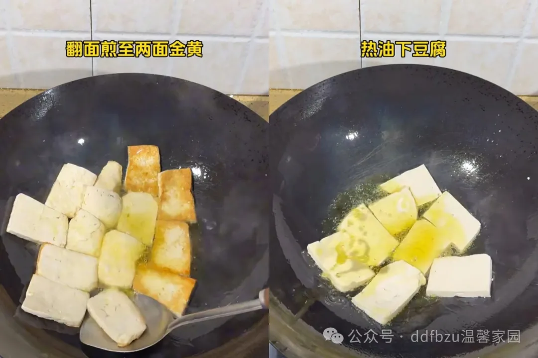 1. 处理豆腐:豆腐切成厚片,锅中倒适量热油,放入豆腐,小火慢煎,翻面煎至两面金黄,捞出控油备用(煎至金黄更吸汁,不易碎);