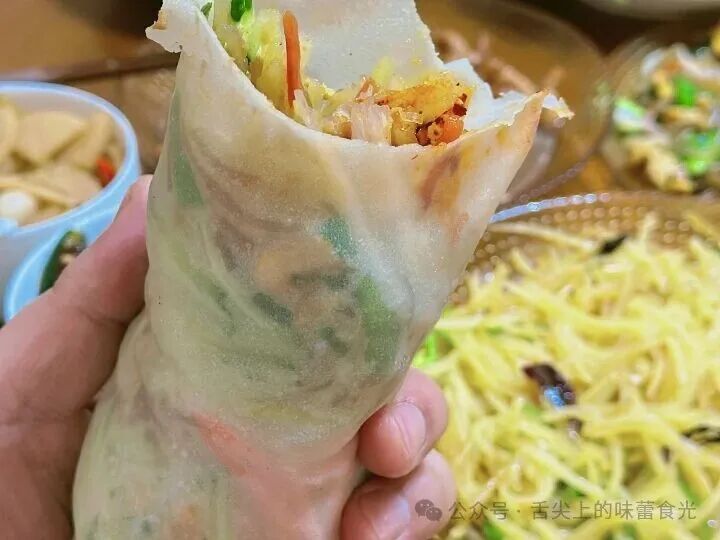 再就是家家户户都能做的春饼卷合菜,这叫咬龙鳞,薄薄一张小饼,卷上豆芽、韭菜、鸡蛋、粉丝,简单一炒,清爽又解腻,龙鳞护身,平平安安,吃着顺口,寓意也实在。春天本来就该吃点鲜灵的青菜,卷上一大口,又香又满足,感觉整个人都跟着春天醒过来了。