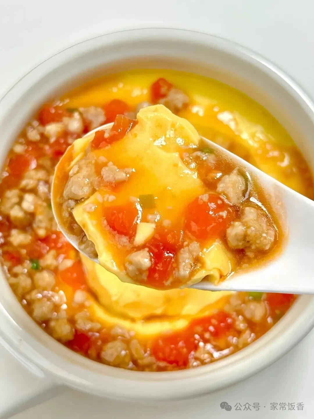 除了普通的蒸蛋之外还有番茄、肉末,酸香可口,蛋白含量直接翻倍。一碗就是一顿饭所需的全部营养了,不需要再加上其他的菜。