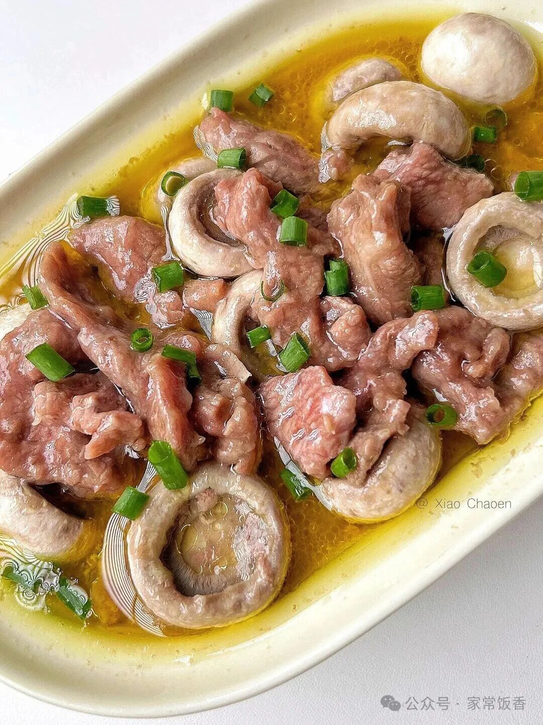 口蘑自带鲜味,与牛肉一起蒸的时候,菌菇的汤汁渗入到肉中,口感嫩滑无比。高蛋白、低脂肪,健身减脂的人也可以大快朵颐。