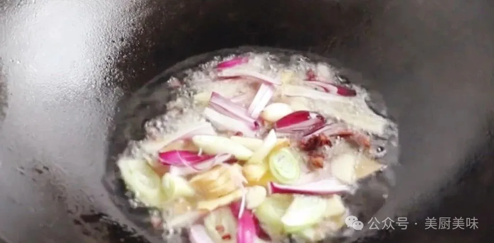 2.起一锅,里面放入稍微多一些的食用油,油热后,放入准备好的姜葱蒜片,花椒,八角,香叶,小火慢炸,把这些香料的香味炸出来,直到它们炸成干黄色,然后捞出来留下炸好的香油备用。