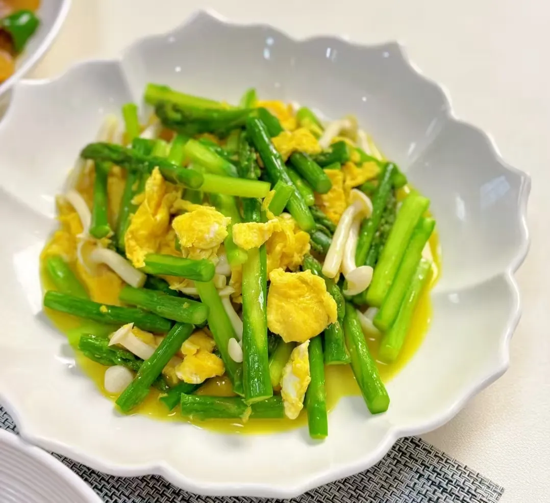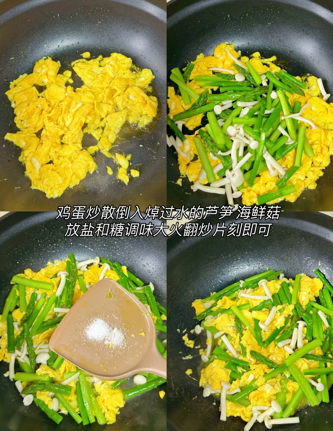 1、将鸡蛋炒散,接着把焯过水的芦笋和海鲜菇倒入锅中,与炒散的鸡蛋混合