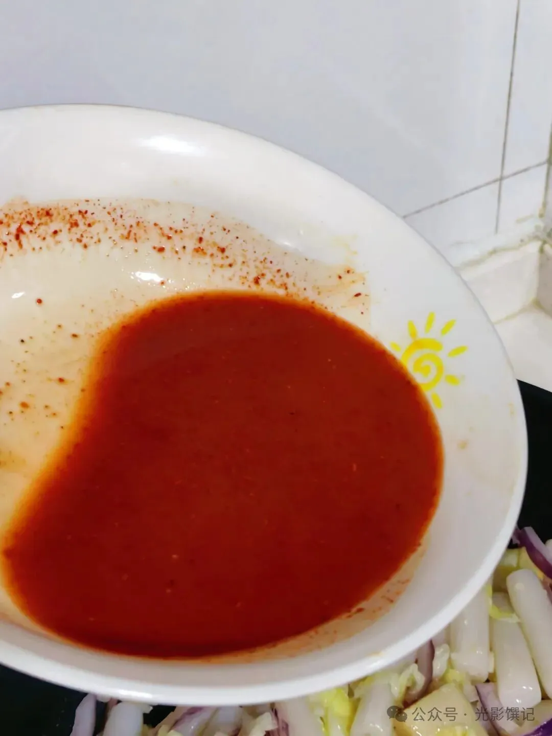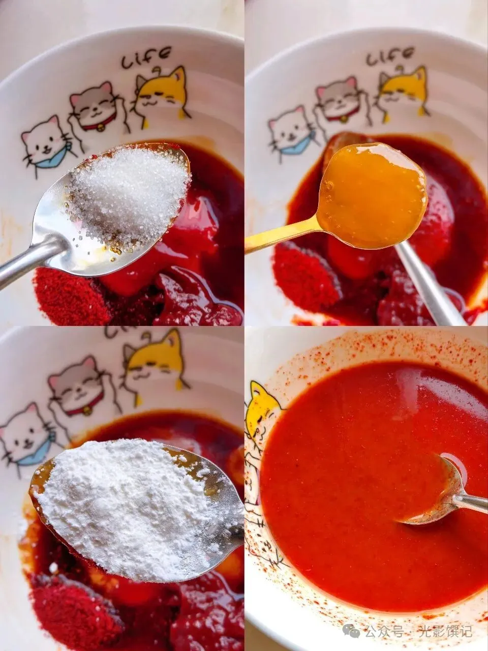 一勺韩式辣椒酱,一勺细辣椒粉,一勺番茄酱,两勺生抽,半勺白糖,一勺蜂蜜,半勺淀粉,半碗清水,搅匀备用。