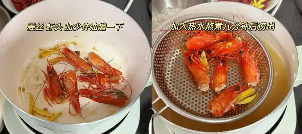 锅烧油把虾头,姜丝炒香,加热水熬煮几分钟。